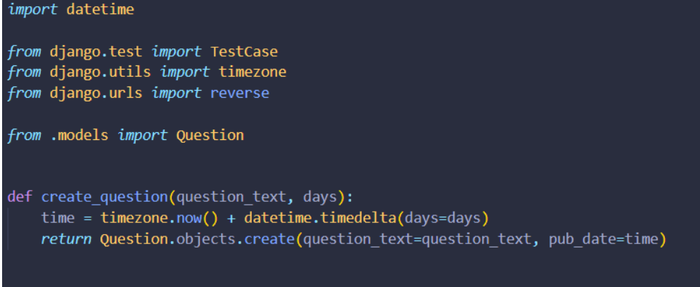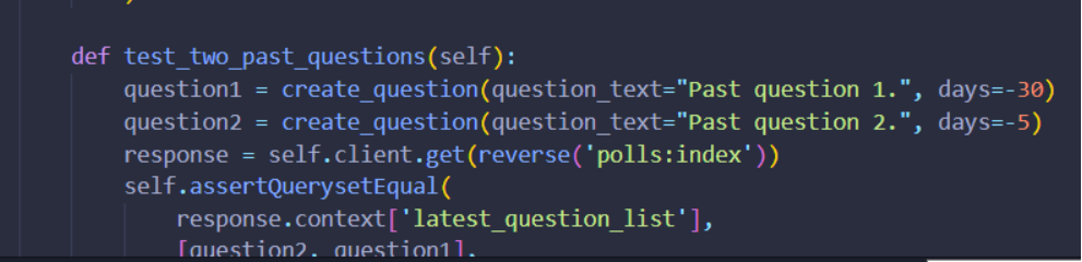 test_past_question에서 우리는 질문을 생성하고 그 질문이 리스트에 나타나는지 확인한다.test_future_question에서 우리는 미래의pub_date로 질문을 만들 것이다. 데이터베이스는 각 테스트 메소드마다 재설정되기 때문에 첫 번째 질문은 더 이상 존재하지 않으므로 인덱스에 질문이 없어야 한다.- 요약하면 사이트에서 관리자 입력 및 사용자 경험에 대한 이야기를 하는 테스트를 만들었고, 모든 상태와 시스템 상태의 모든 새로운 변경 사항에 대해 예상하는 결과가 출력되는지 확인하는 테스팅이다.