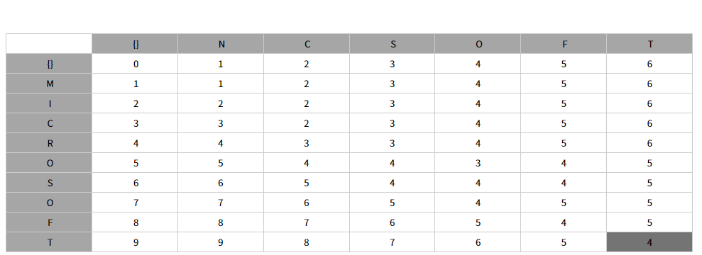 최초는 공집합과 비교해 문자열 길이만큼 1씩 카운트를 준다(공집합에서 그 문자열이 되려면 열마나 삽입되어야 하는가?)