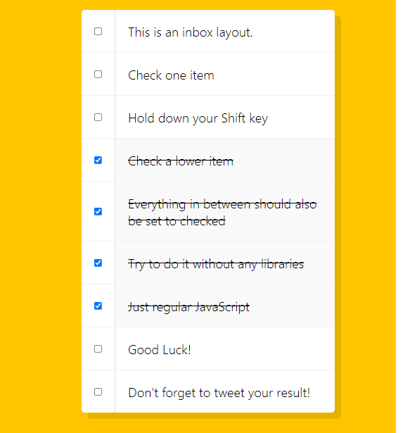 - 각각의 checkbox들에 대해 체크한 부분부터 마지막 체크한 부분까지(this는 click event) inBetween을 false에서 true로 바꾸고 true로 바뀐 checkbox의 checked속성을 true로 바꾼다.