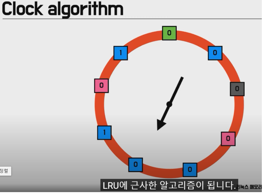 - 각 page마다 상태 bit0, 1을 가지고 교체되면 한바퀴 돌면서 1은 0으로 0은 교체 대상이 되는 알고리즘