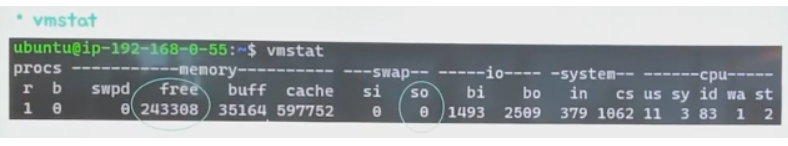 - swpd는 사용하는 가상메모리 량. free는 사용가능한 메인메모리량