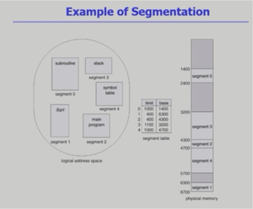 - Segment table : base(starting physical address), limit(length)