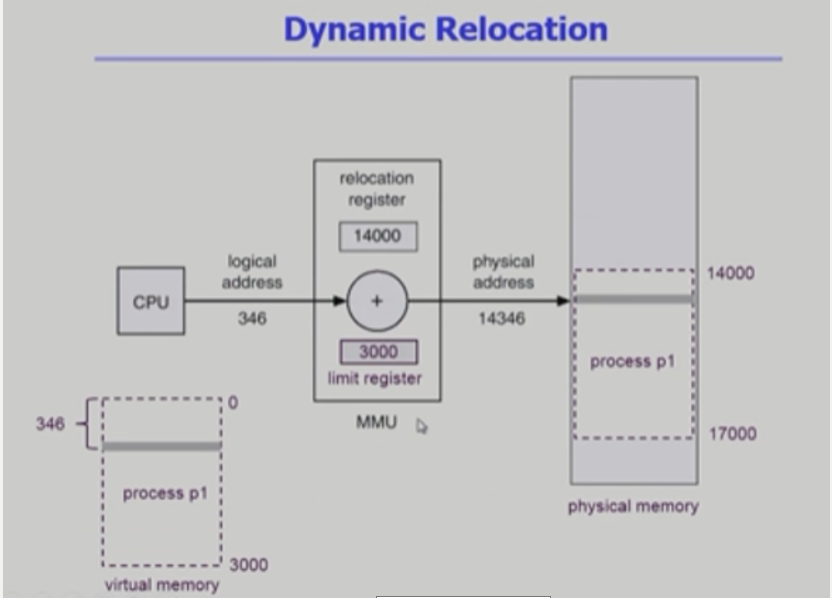 - 사용자 프로세스가 CPU에서 수행되며 생성해내는 모든 주소값에 대해 base register (relocation register)의 값을 더한다.
