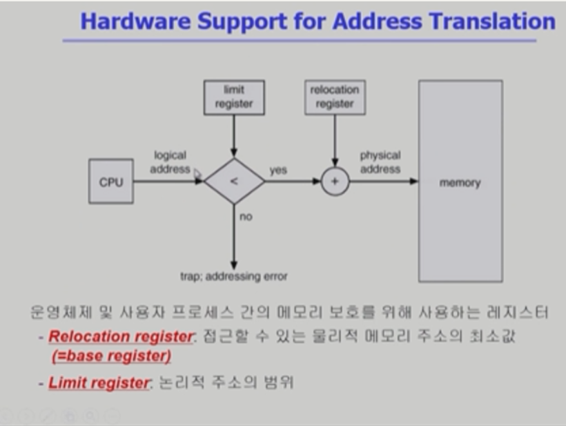 - 하드웨어적인 지원 필요 (base and limit registers, MMU)