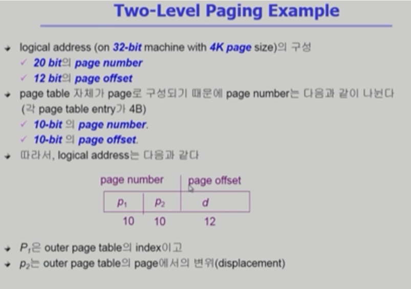 - 32 bit 주소체계는 2^32 (4G), page size가 4K면 1M개의 page table entry 필요.