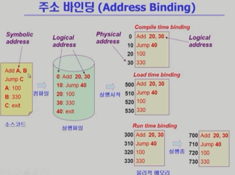 Symbolic (함수 명 등 숫자가 아닌 위치) -> 컴파일을 통해 논리주소(숫자) -> 실행은 물리 주소