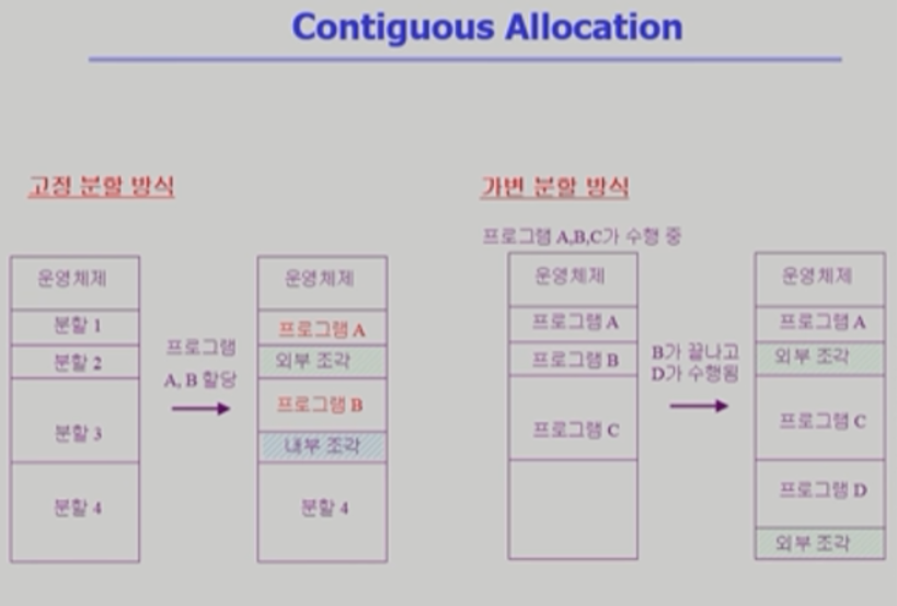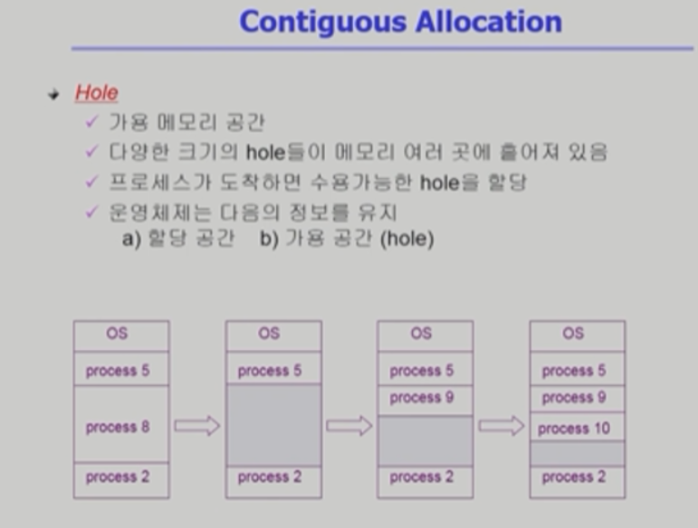 - Contiguous allocation : 각각 프로세스가 메모리의 연속적인 공간에 적재