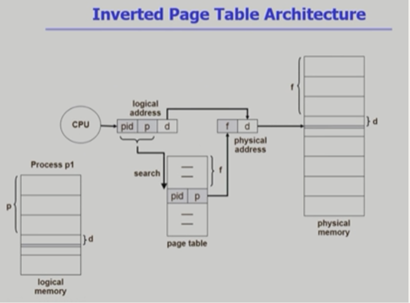- 기존에 프로세스마다 존재하던 page table. inverted page table는 page table은 하나. 물리 주소영역의 frame만큼의 table 하나.