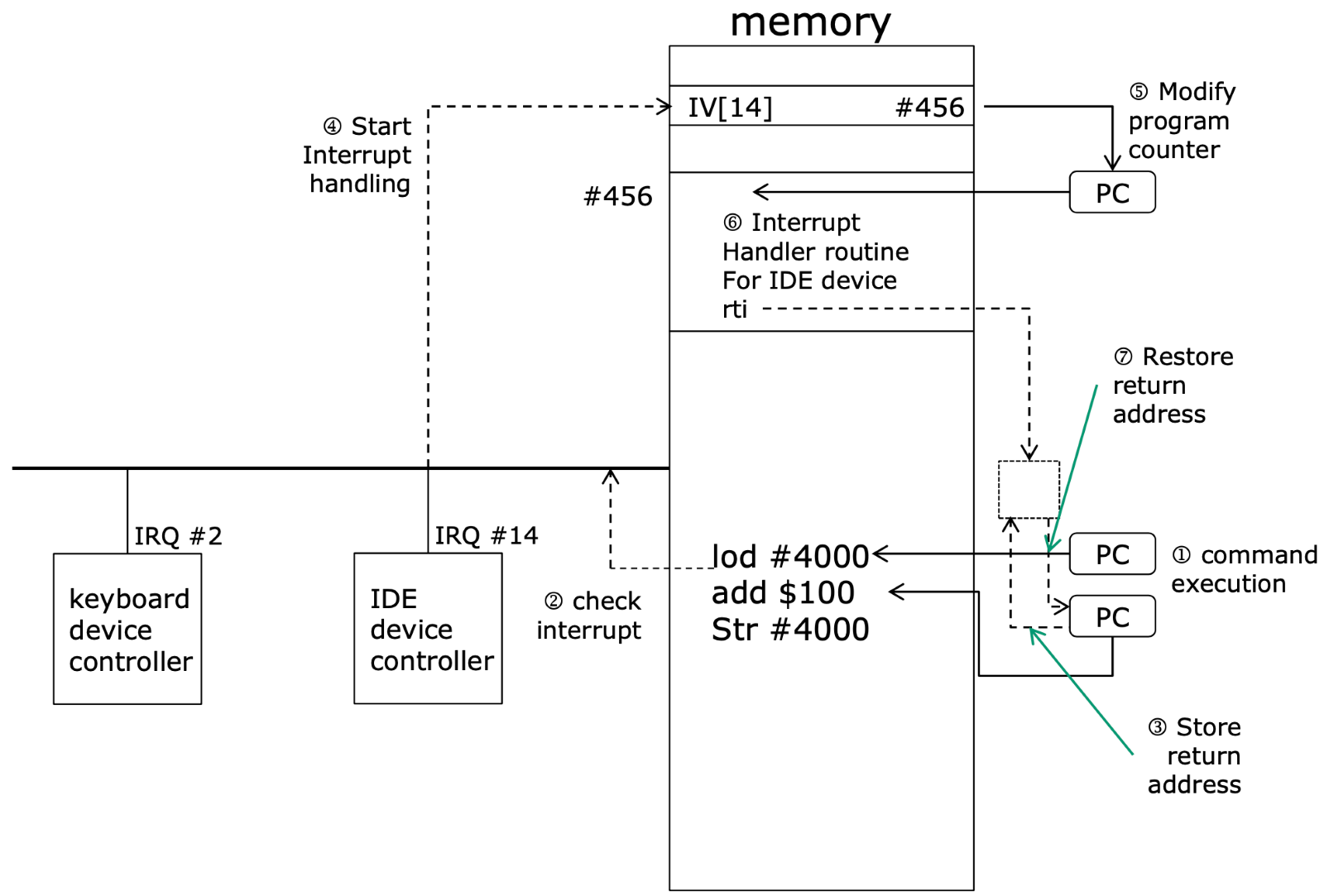 Memory에서 위쪽(4,5,6수행)은 OS (interrupt해결), 아래쪽(1,2,3,7)은 원래 프로세스IntellJ(ex-저장과정 수행 프로세스)