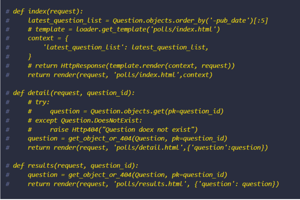 - 일반적인 경우(URL에서 전달된 매개변수에 따라 DB에서 DB를 가져오고 템플릿을 로드하고 렌더링된 템플릿을 리턴하는 경우)를 위해 generic view라는 shortcut을 제공함.