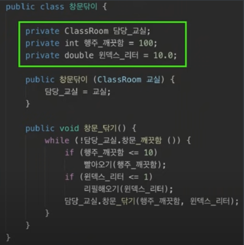 - 외부에서 명령할 것들만 public, 내부구조는 private로 감춰놓음