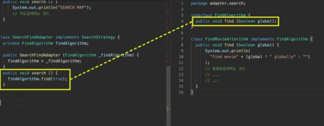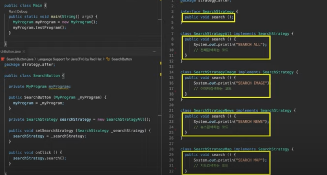 - interface의 search를 각 전략들이 필수적으로 선언 해야함.