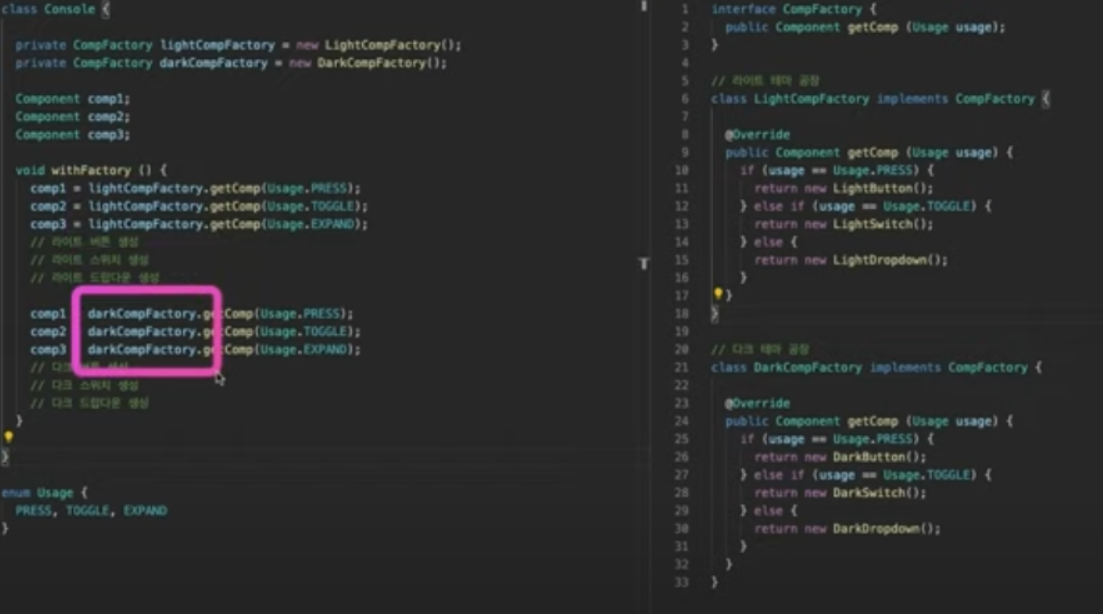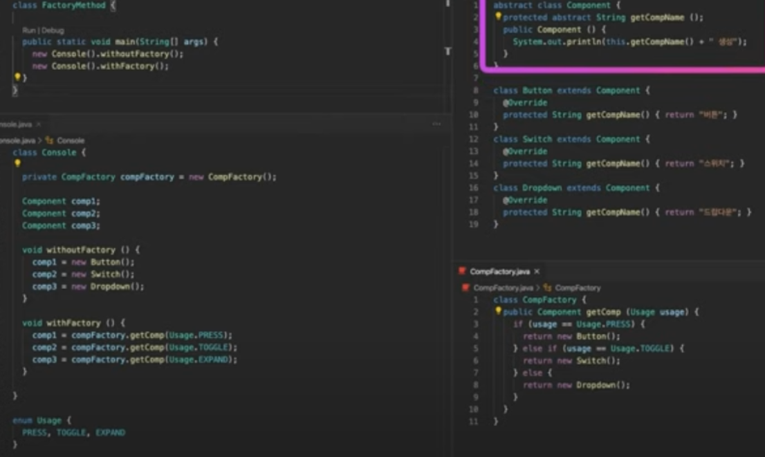 - 기본 팩토리를 추상팩토리로 놔두고 상속해서 팩토리들을 생성. 찍혀나올 부품들이 달라지도록 함.