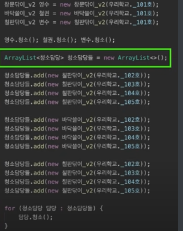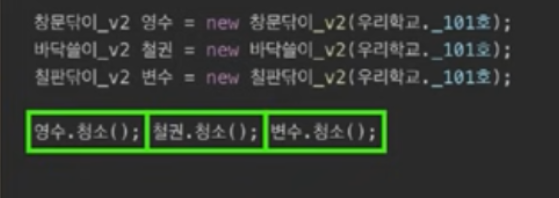 - 청소라는 동일한 메서드로 일을 시킬 수 있게 override함.